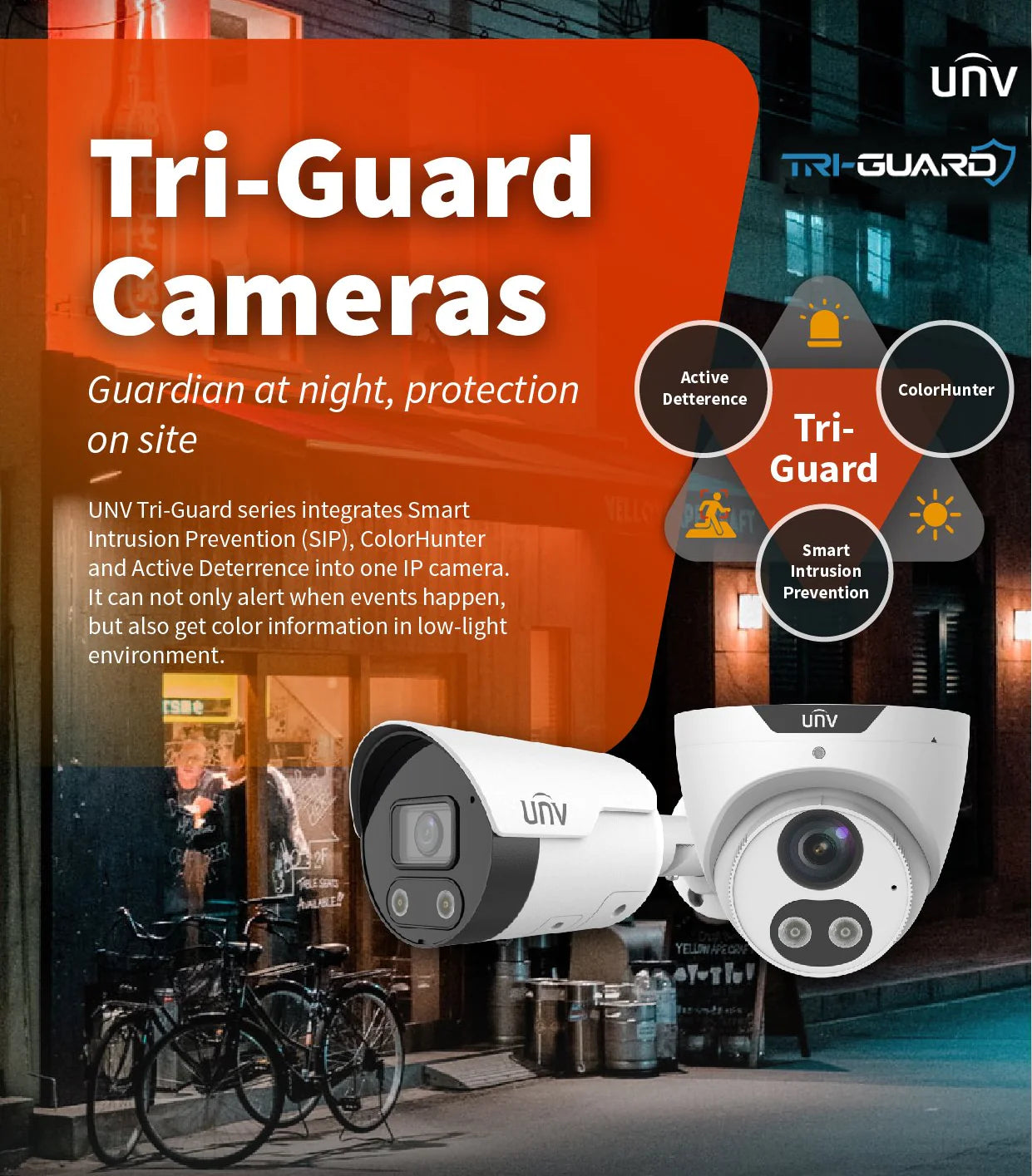 UNV Tri-Guard series are designed to solve the above problems, by integrating Smart Intrusion Prevention (SIP), ColorHunter and Active Deterrence in one.
