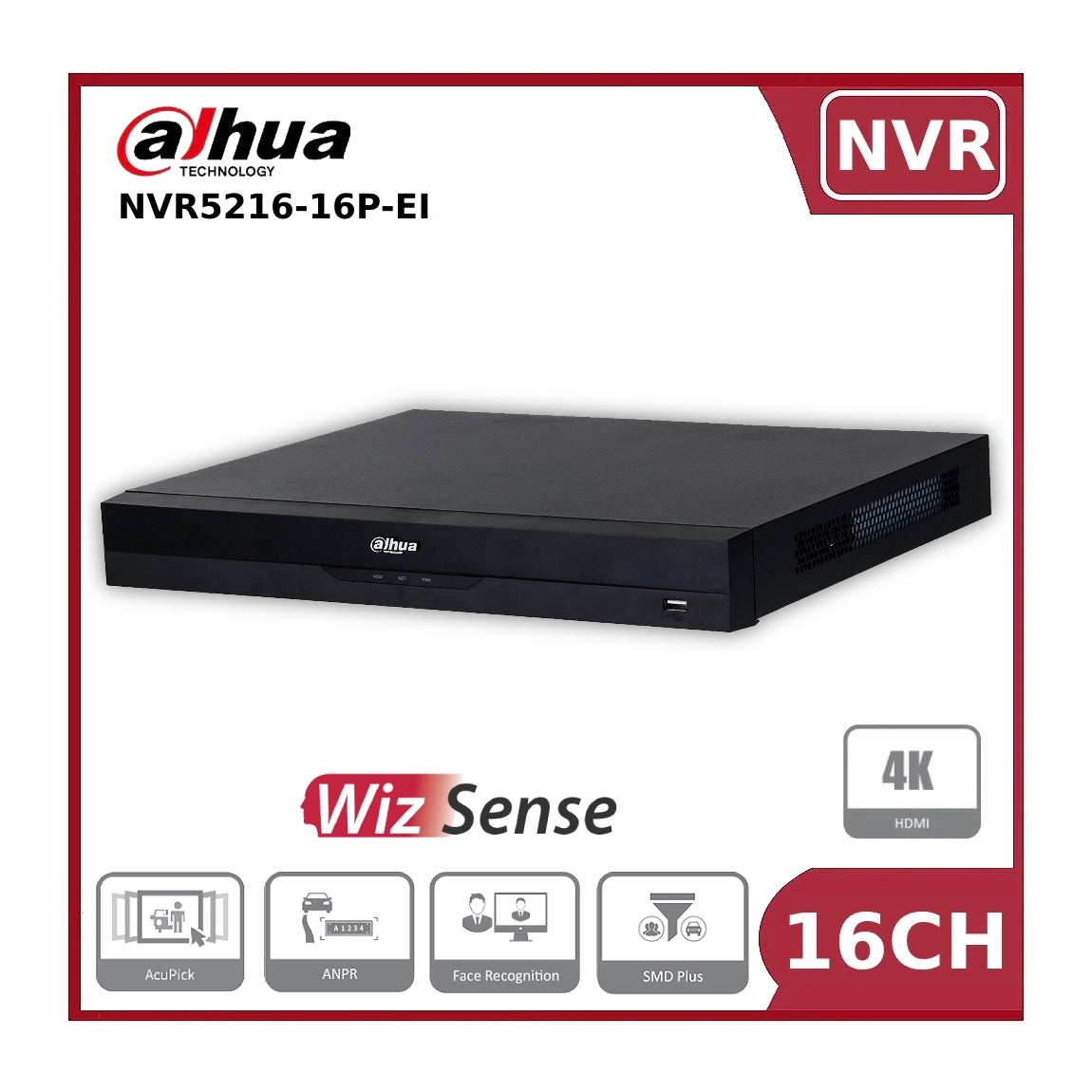 Dahua DHI-NVR5216-16P-EI 16 Channel NVR 16CH 2HDDs 16PoE 4K WizSense Network Video Recorder